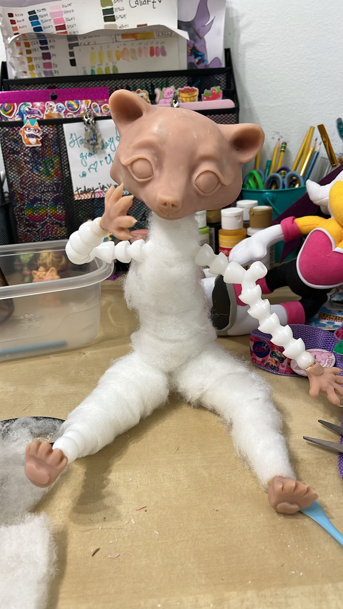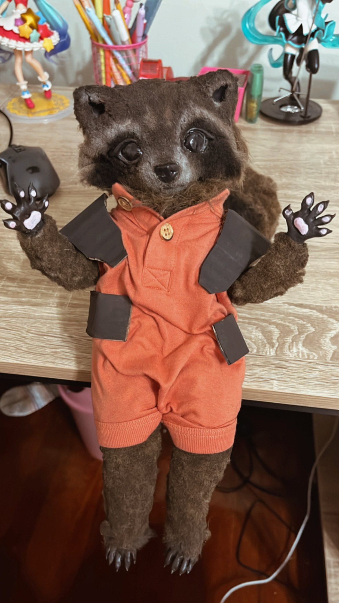 Made in 2025, the Rocket Doll was made for Fan Expo 2025. Within less than a month of planning, the doll was created from April 18th and finished on May 16th. This was a first-time attempt at making a custom doll. *Tin Foil, Clay, Plastic Armatures, Quilt Padding, Faux Fur, Air brush paint, Acrylic Paint, Toddler onesie, Gloss Varnish.